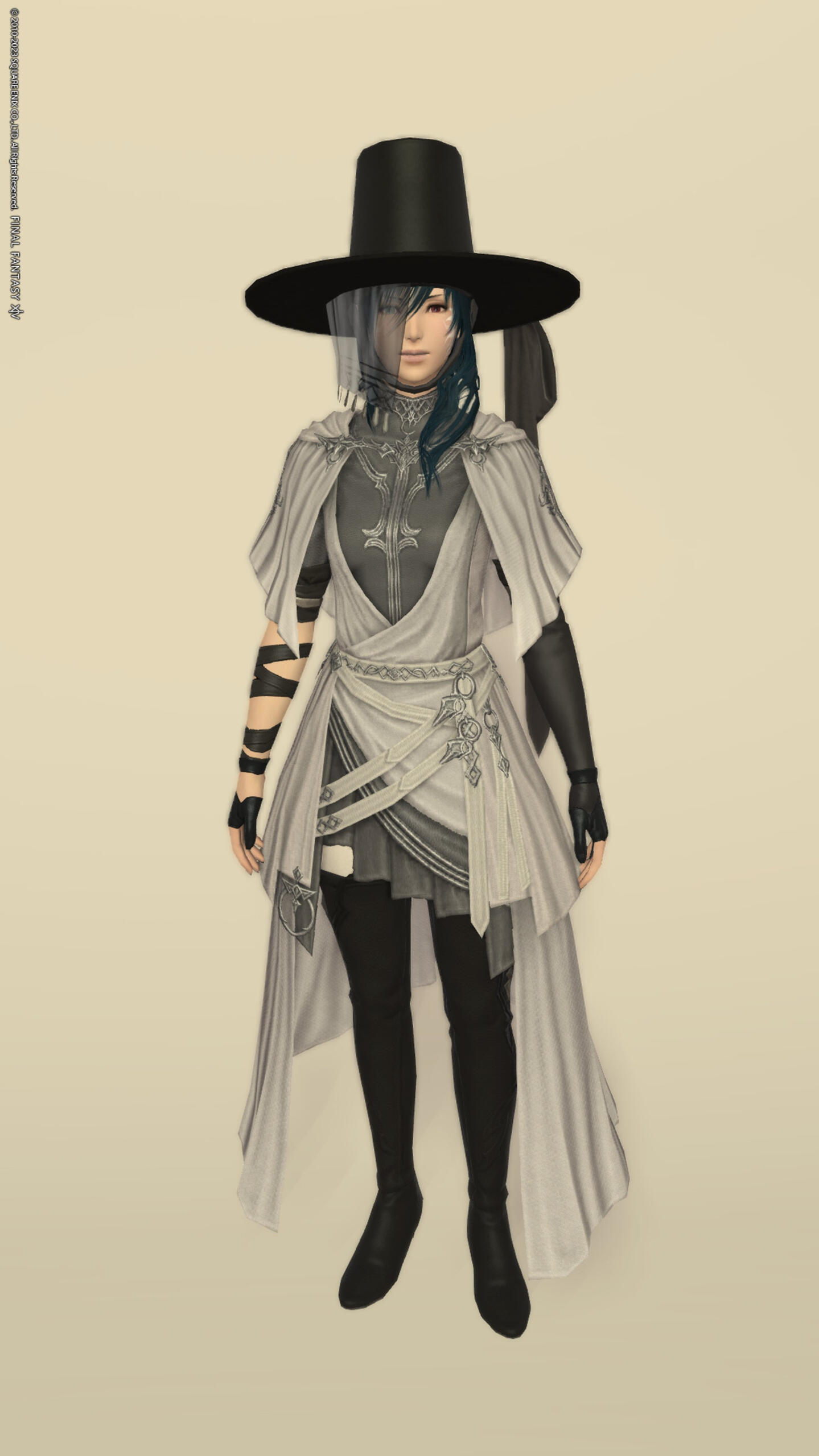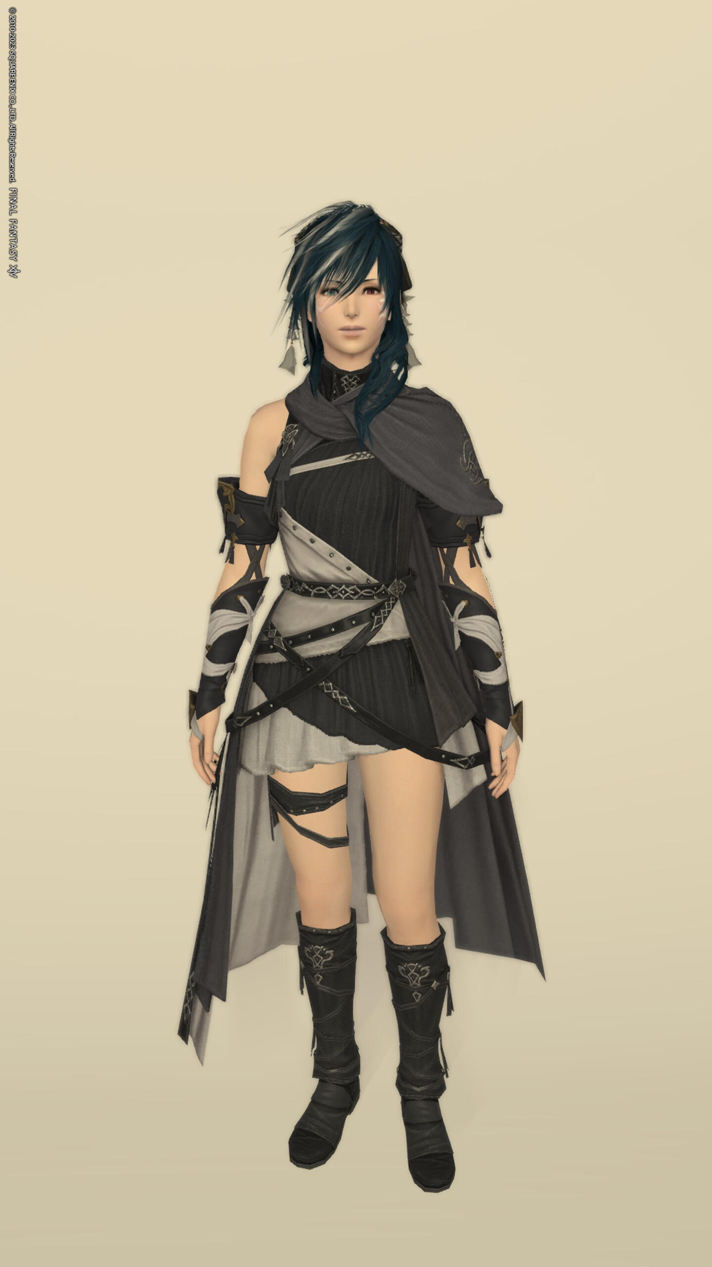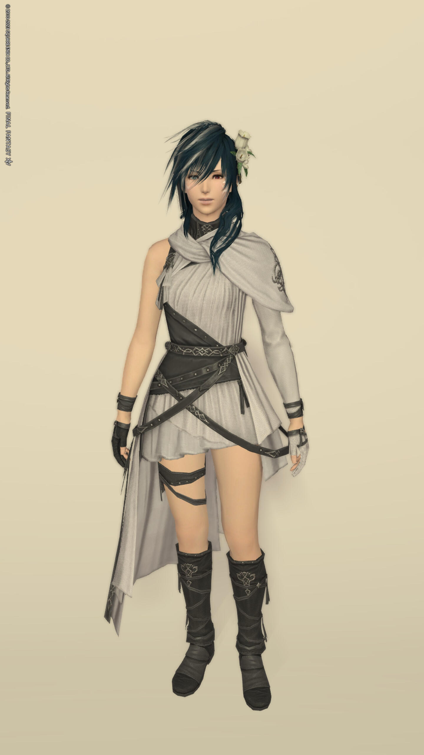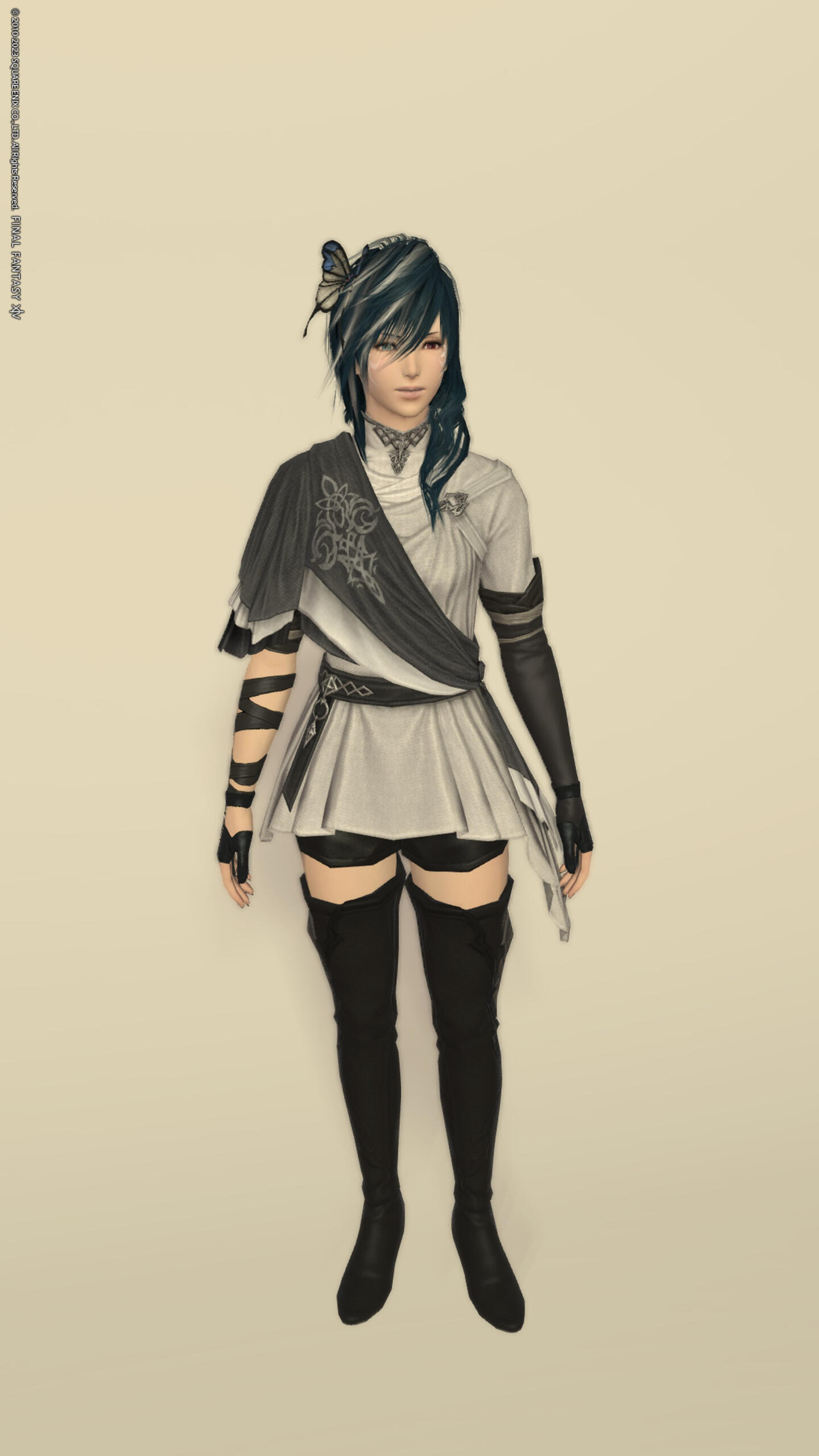 Description: Taimu is a very petite Midlander Hyur with peachy skin, ruby-red (R) and sapphire-blue (L) eyes and blue-grey hair with streaks of white. She often dons a similar blue-grey colored Convoker's robe and dark gloves with a pair of Ultima's Horns. Lastly white stockings and a pair of Eastern Maiden's boots finishes her look.