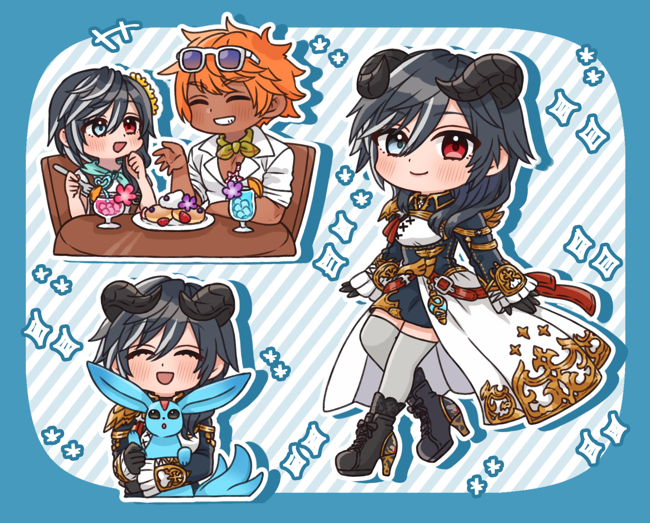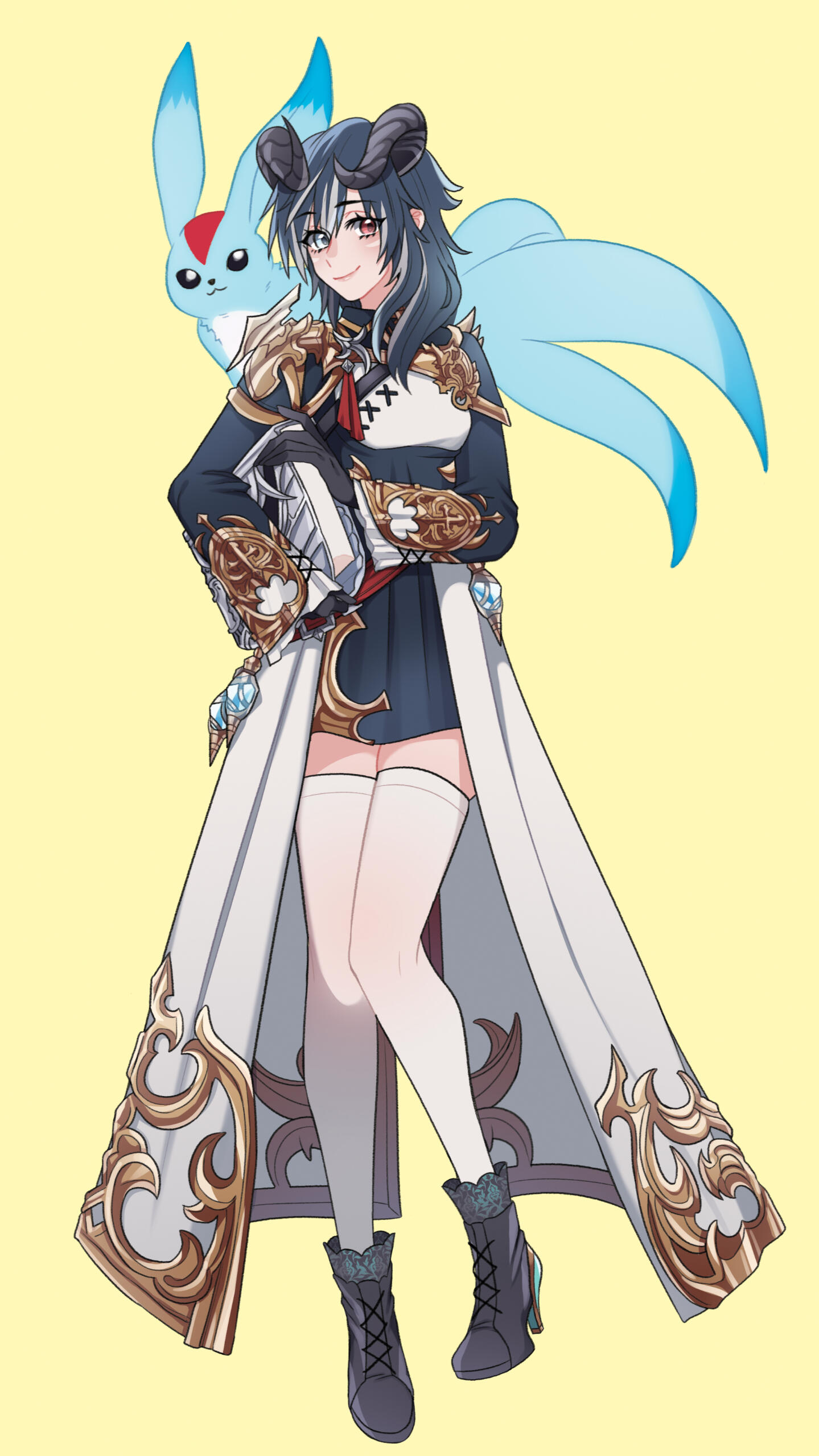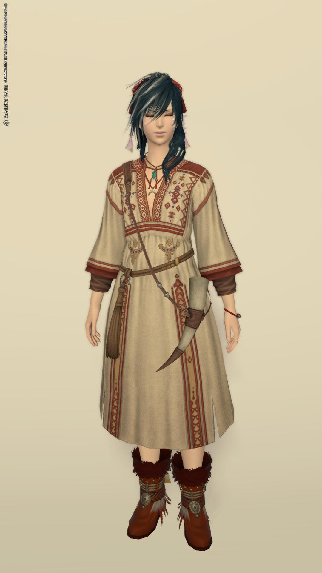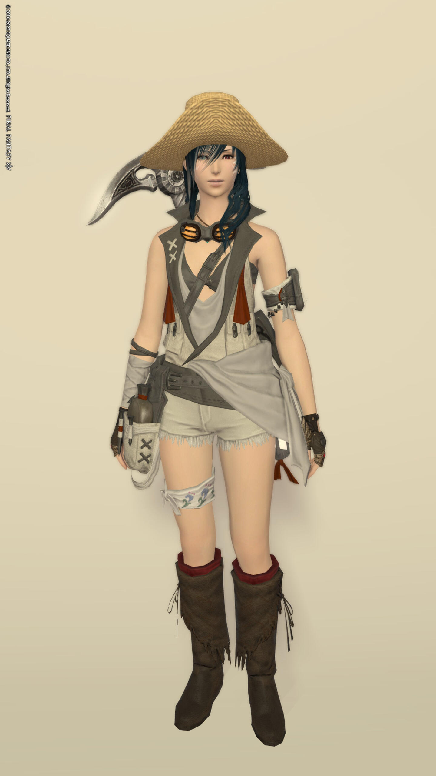 Description: Taimu is a very petite Midlander Hyur with peachy skin, ruby-red (R) and sapphire-blue (L) eyes and blue-grey hair with streaks of white. She often dons a similar blue-grey colored Convoker's robe and dark gloves with a pair of Ultima's Horns. Lastly white stockings and a pair of Eastern Maiden's boots finishes her look.